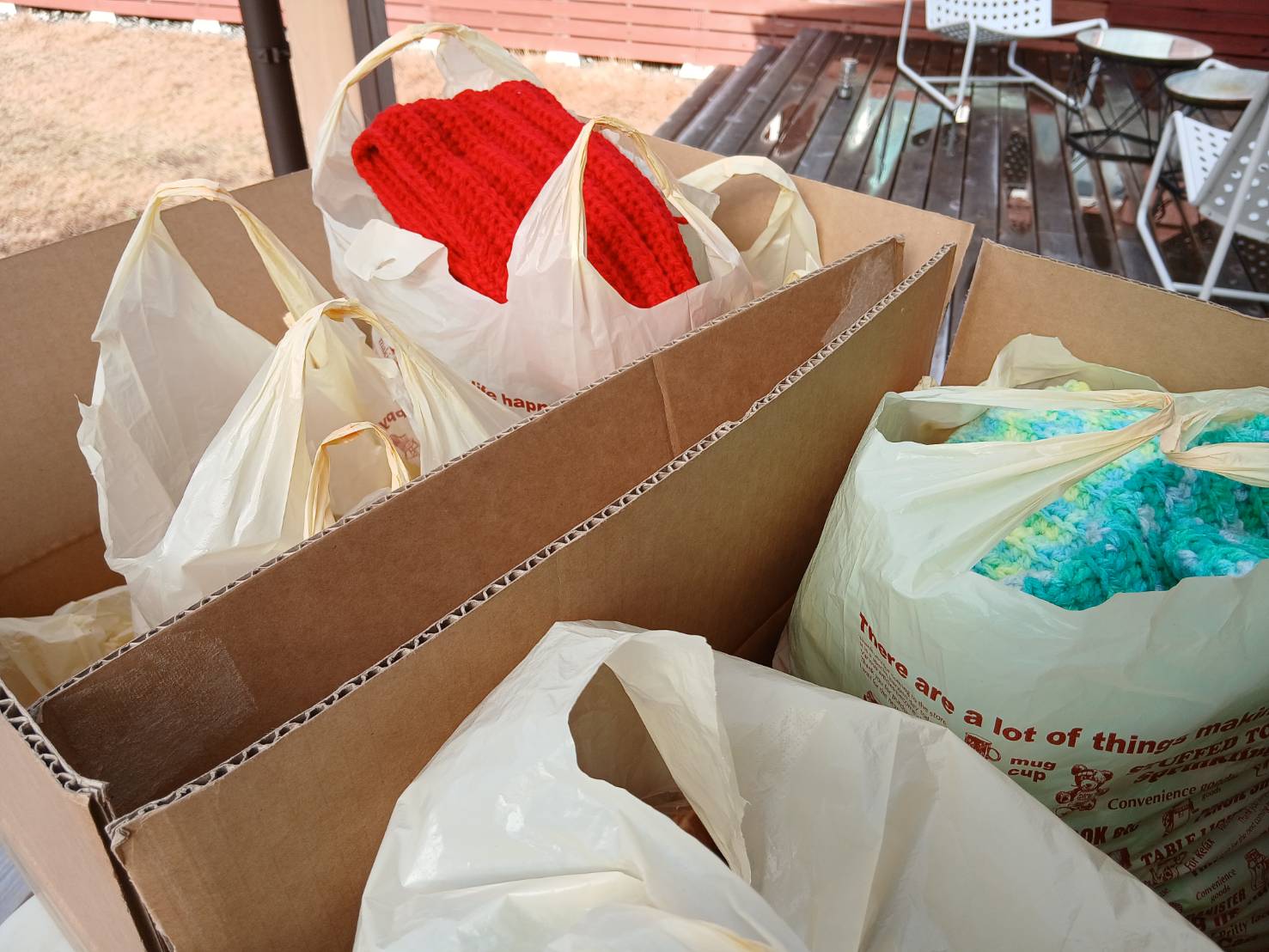 アンの家としては仮設住宅などに靴下カバーやマフラー帽子など合計80点ほどを寄贈させていただきました。