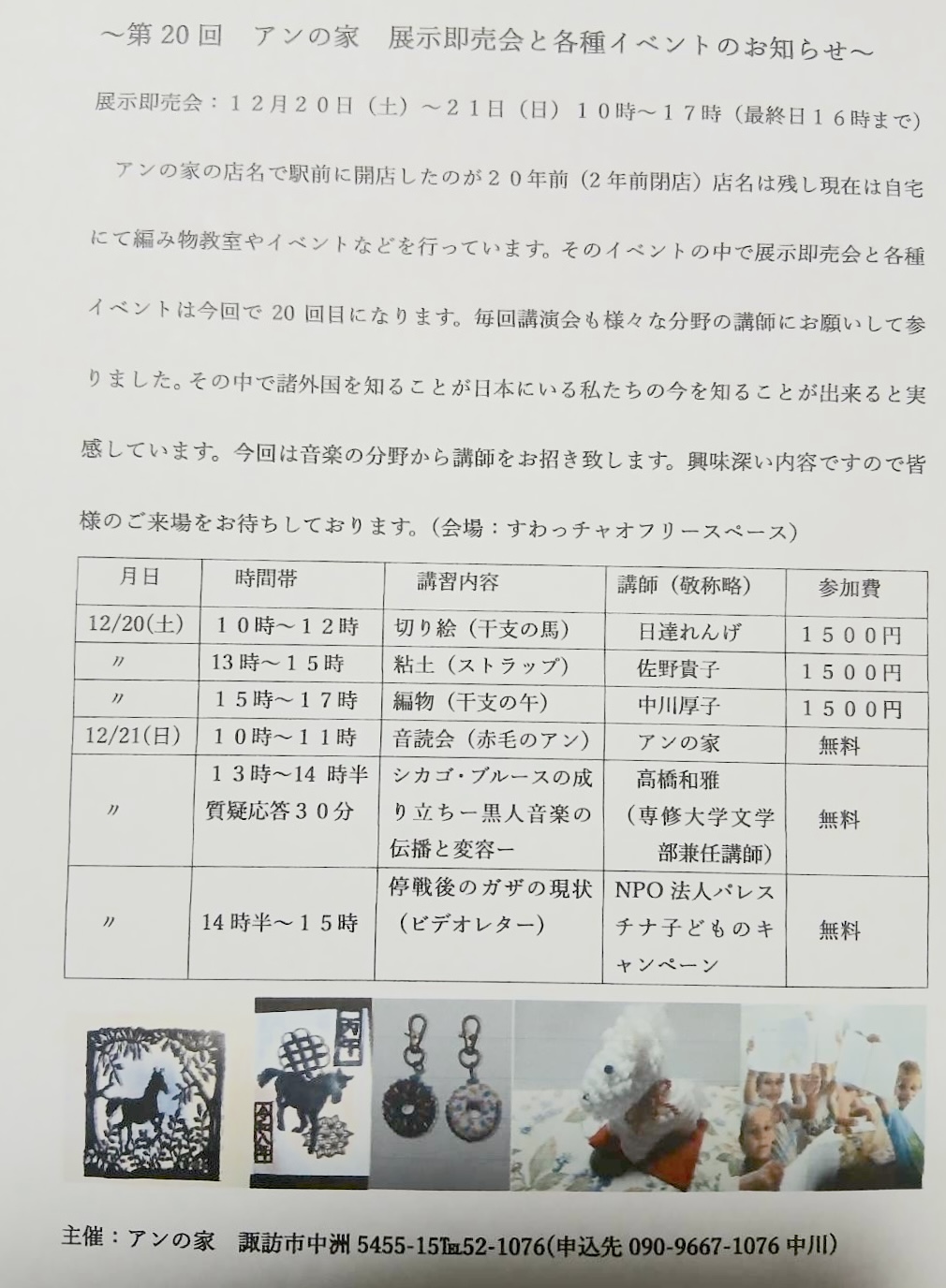 こんにちは。諏訪市の手芸品、編み物教室のアンの家です。